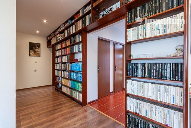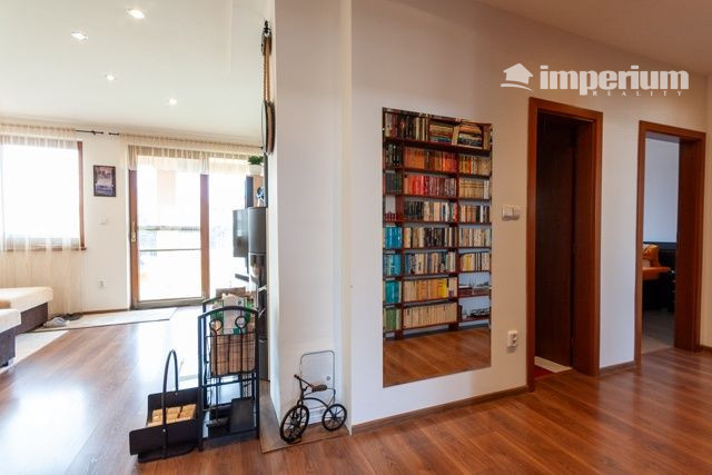 Predsieň, samostatné WC, kde je aj práčka a plynový kotol, kuchyňa s obývacou izbou s výstupom na terasu, chodba so vstavanou knižnicou, kúpeľňa s rohovou vaňou a so sprchovacím kútom, 2 samostatné izby, sklad. V izbách a v predsieni sú vstavané skrine.