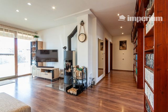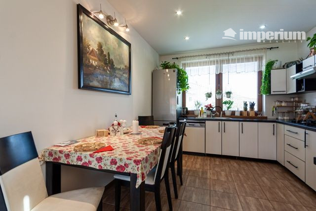 Priestranná vstavaná kuchynská linka so spotrebičmi (umývačka riadu, elektrická rúra, plynová varná doska, digestor, samostatná chladnička s mrazničkou) s prepojením s obývacou izbou, kde dominujú krbové kachle s komínom, klimatizácia v každej miestnosti, terasa. V celom dome je bodové osvetlenie, nástenné osvetlenie obrazov.