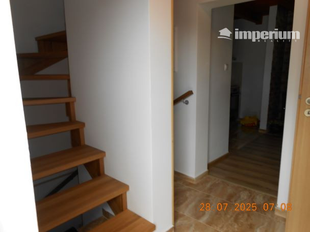 Zádverie, vchod so schodiskom do suterénu a na poschodie do izieb, vstup do kúpeľne s toaletou, sprchou, umývadlom a kúpeľňovým nábytkom, ďalej obývacia izba s dverami na terasu prepojená s kuchyňou.